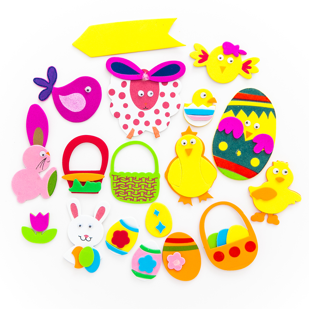 Sada vrstvených penových nálepiek s veľkonočnou tematikou v rôznych farbách a tvaroch.