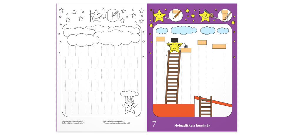 V pracovnom zošite Hviezdička 1 nájdete aj úlohy, ktoré podporujú fantáziu, obohatia slovnú zásobu, myslenie, predstavu o rozmeroch a tvaroch, ale i schopnosť samostatne uvažovať. Ako môže vzniknúť oheň? A kedy vzniká dúha? Prečo sú na mori majáky? Aj na takéto otázky môžete hľadať odpovede spoločne so svojimi deťmi. S Hviezdičkou môžete objavovať doma a zmysluplne tak vyplniť voľný čas. Pracovný zošit je vhodný aj pre spoločnú prácu detí v materskej škole.