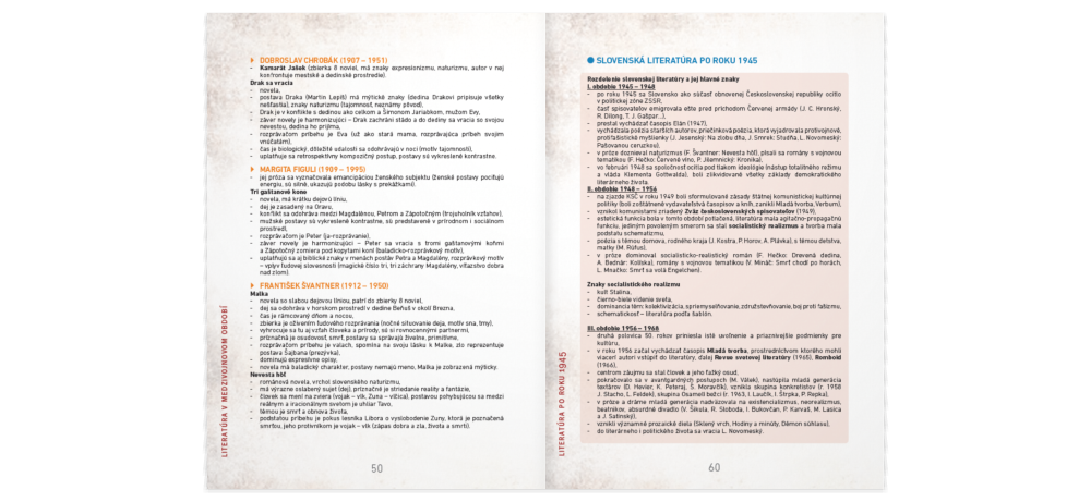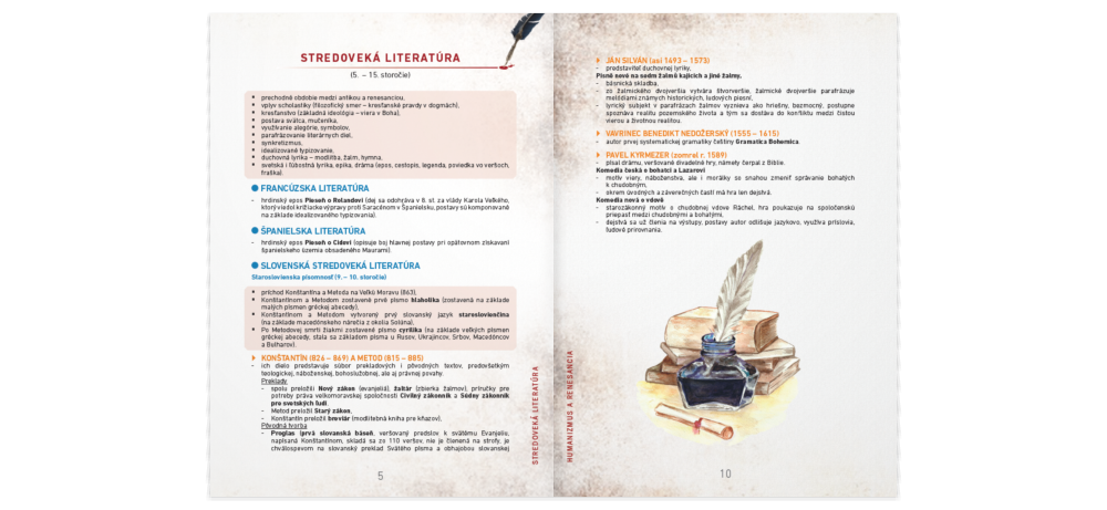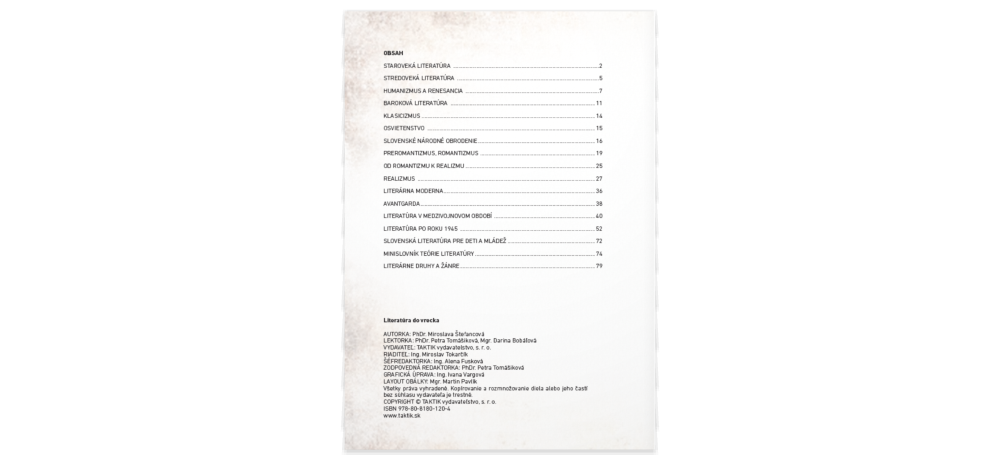 Zorientovať sa Ti pomôže Literatúra do vrecka! Malý pomocník (vo formáte A6) obsahuje chronologický prehľad literárnych období s ich charakteristickými znakmi. Stručne predstavuje najvýznamnejších autorov a ich diela aj s informáciami o obsahu, spoločenských podmienkach ich vzniku a hlavnú myšlienku.