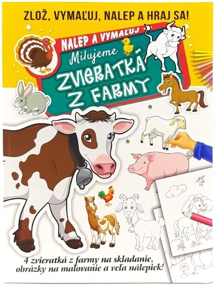 4 zvieratká z farmy na skladania, obrázky na maľovanie a veľa nálepiek. Zlož, vymaľuj, nalep a hraj sa.