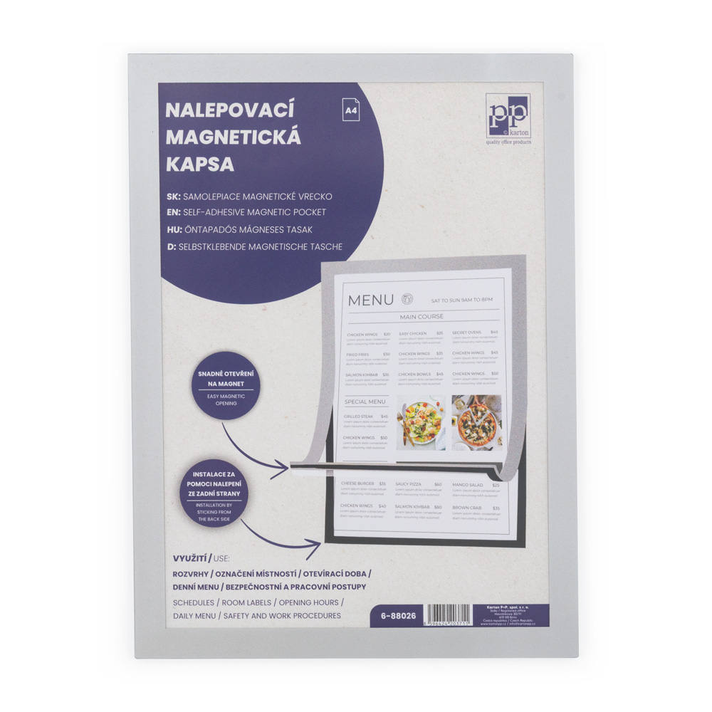 Magnetické nalepovacie vrecko A4 so strieborným okrajom pre prehľadné označenie miestností, otváracej doby, rozvrhov alebo iných dôležitých informácií. Ideálne na použitie v kanceláriách, školách, zdravotníckych zariadeniach i obchodných priestoroch. Samolepiaca zadná strana umožňuje pevné uchytenie na hladké povrchy a transparentnú prednú časť zaisťuje ľahké vloženie a rýchlu výmenu dokumentu bez nutnosti vrecko odlepovať.