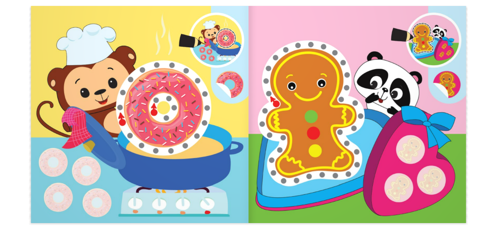 Každá strana obsahuje pestrofarebný obrázok a dve úlohy – nalepovanie nálepiek a obkresľovanie. V hornom rohu sa nachádza pomôcka, ktorá dieťaťu napovedá, ako by mal vyzerať obrázok po správnom vyriešení oboch úloh.