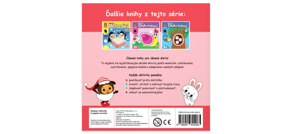 Kniha Nalepuj a obkresľuj – Čo papkajú zvieratká? prepája dvojicu obľúbených detských aktivít – nalepovanie a obkresľovanie. Deti prostredníctvom samolepiek a spájania bodiek spoznajú veselých zvieracích kamarátov aj maškrty, na ktorých si radi pochutnajú. Zároveň si rozhýbu pršteky, naučia sa nové tvary a precvičia si pozornosť, jemnú motoriku aj sústredenie.