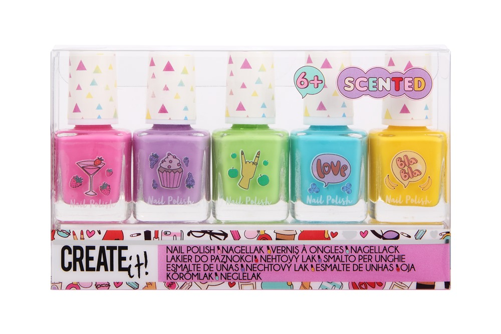 Doprajte deťom hravú manikúru s voňavou sadou Create it! Nail Polish Scented 5 Pack. Tento farebný set premení lakovanie nechtov na zábavný zážitok nielen vďaka výrazným odtieňom, ale aj vďaka príjemným ovocným vôňam. Každá farba je zladená s konkrétnym ovocím, takže žltý lak vonia po banáne, ružový po jahodách a ďalšie odtiene poteší rovnako hravou vôňou. Lakovanie sa tak stáva kreatívnou aktivitou, ktorá deti baví a podporuje ich fantáziu. Vône sú príjemné, ale samozrejme len na obdivovanie, nie na ochutnávanie. Sada obsahuje päť voňavých lakov na nechty: ružový jahoda, fialový hrozno, zelený jablko, modrý čučoriedka a žltý banán. Ideálna voľba ako darček alebo malá radosť pre deti, ktoré si chcú užiť farebné a voňavé tvorenie.