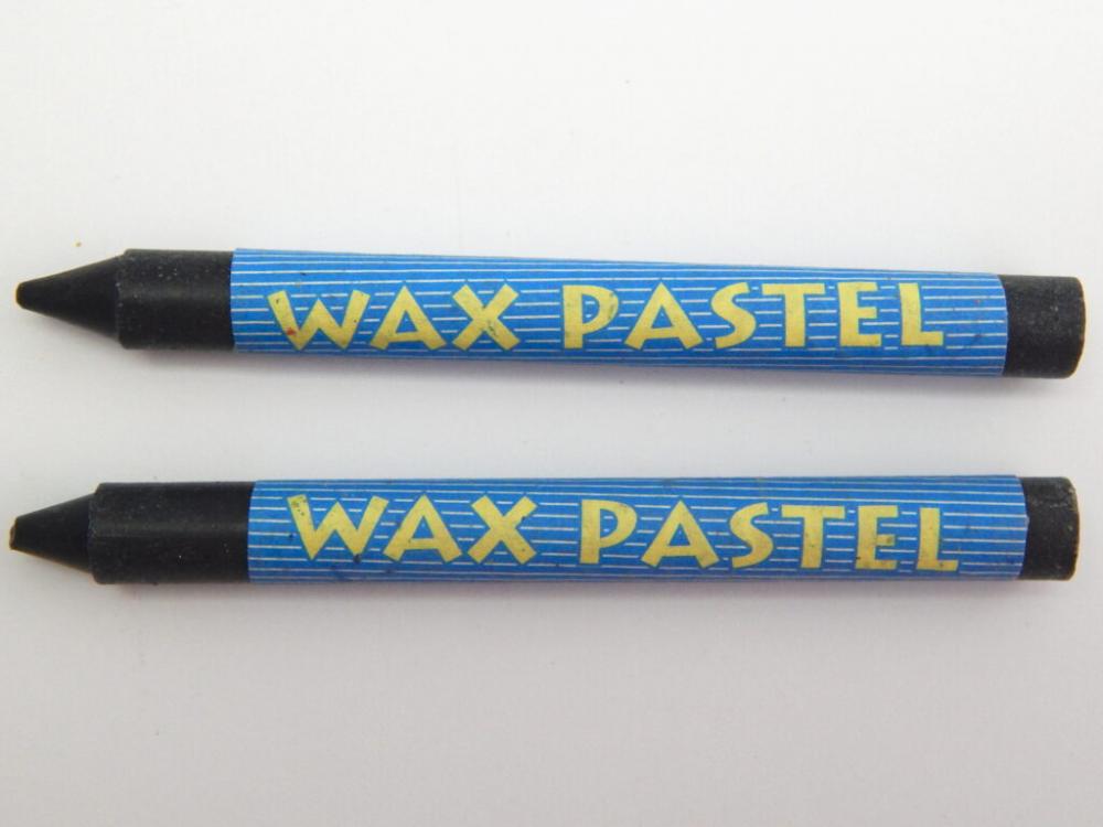 Okrúhla vosková pastelka obalená zavin. štítkom s nápisom WAX CRAYONS, používa sa na školské, aranžérske a umelecké kreslenie.