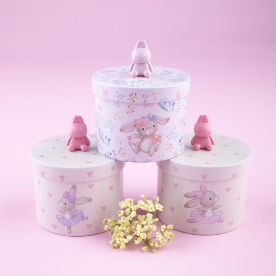 Roztomilé plechové dózy od princeznej Mimi s láskyplnými ilustrovanými vzormi zajačikov (ružové so srdiečkami a baletnými zajačikmi, fialové s jemnými kvietkami a kvetinovými venčekmi) majú na viečku super roztomilú rúčku v tvare zajačika (ružovú alebo ružovú), vďaka ktorej je hračka ich otvárať a zatvárať. ideálne na malé tajomstvá a poklady.