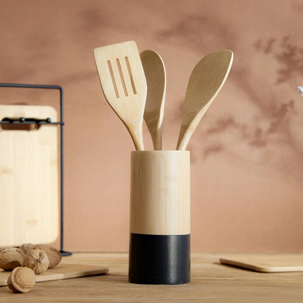 Použitie bambusového dreva na výrobu tejto nádoby na príbory jej nielen dodáva dobrý vzhľad, ale je aj trvácna a odolná. Vlastnosti tohto organického, ekologického materiálu ho robia odolným voči vlhkosti , čo je nevyhnutné pri práci v kuchyni.