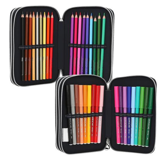 Tri samostatné priehradky peračníka sú kompletne naplnené 18 farbičkami a fixkami, 2 ceruzkami, gumou, strúhadlom, pravítkom, nožnicami, lepidlom v tyčinke a malým vreckom na suchý zips. Materiál: 100 % polyester.