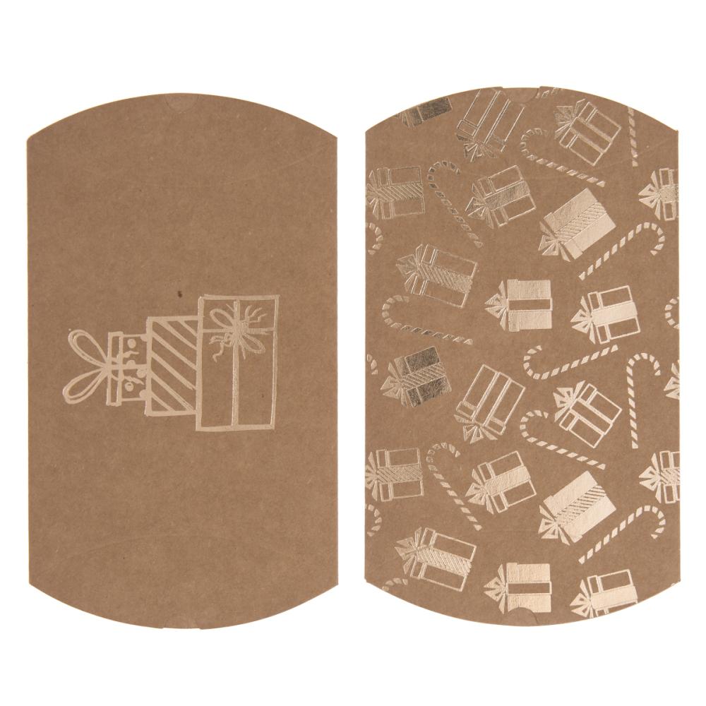 Skladacie krabičky typu vankúšová krabička s motívom zlatých darčekov budú perfektné na vaše vianočné darčeky. Môžete do nich vložiť šperky, darčekové poukážky alebo iné drobné darčeky. Tieto kartónové krabičky je možné dodatočne ozdobiť, napríklad nálepkami, drevenými prvkami alebo stuhami. Krabičky si musíte zložiť sami.
