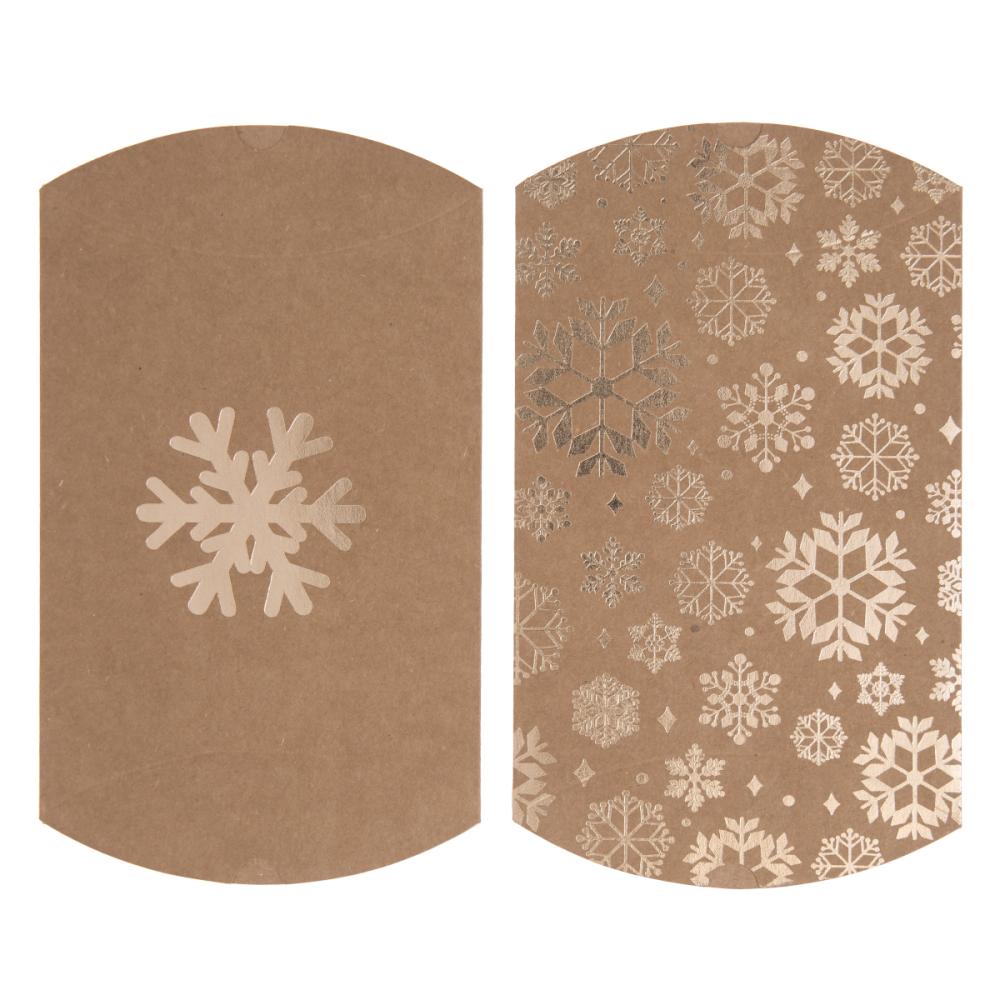 Skladacie krabičky typu vankúšová krabička s motívom zlatých snehových vločiek budú perfektné na vaše vianočné darčeky. Môžete do nich vložiť šperky, darčekové poukážky alebo iné drobné darčeky. Tieto kartónové krabičky je možné dodatočne ozdobiť, napríklad nálepkami, drevenými prvkami alebo stuhami. Krabičky si musíte zložiť sami.