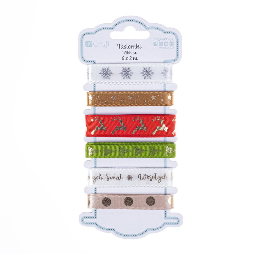 Vianočná sada saténových a rypsových stužiek obohatená motívmi zlatých snehových vločiek, hviezd, sobov a vianočných stromčekov.